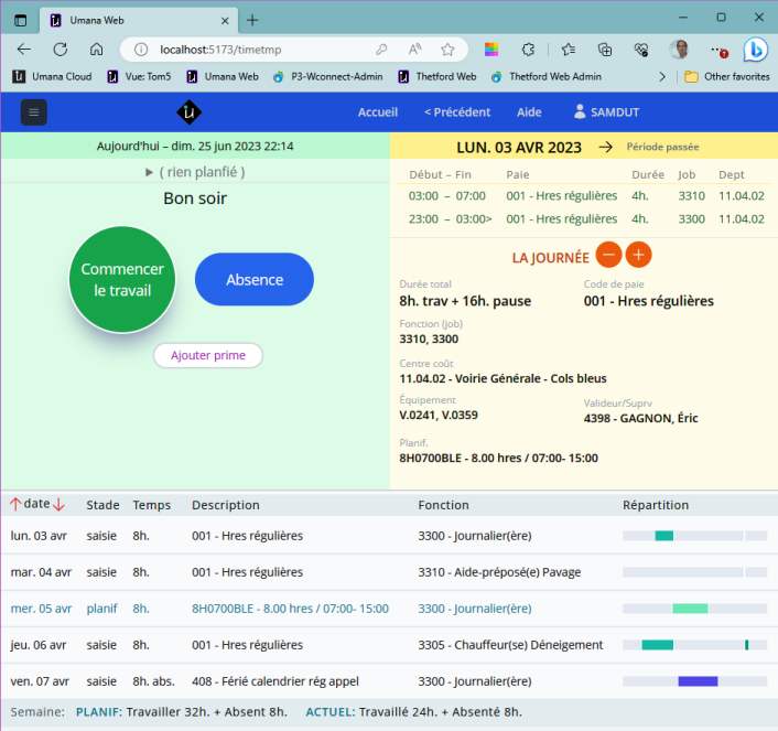Le deuxième panneau (à droite) JOUR (jaune) contient les détails d'une journée et vous permet d'apporter des corrections (jusqu'à ce qu'elles soient approuvées par votre supérieur).